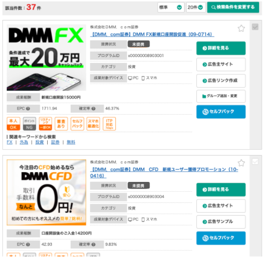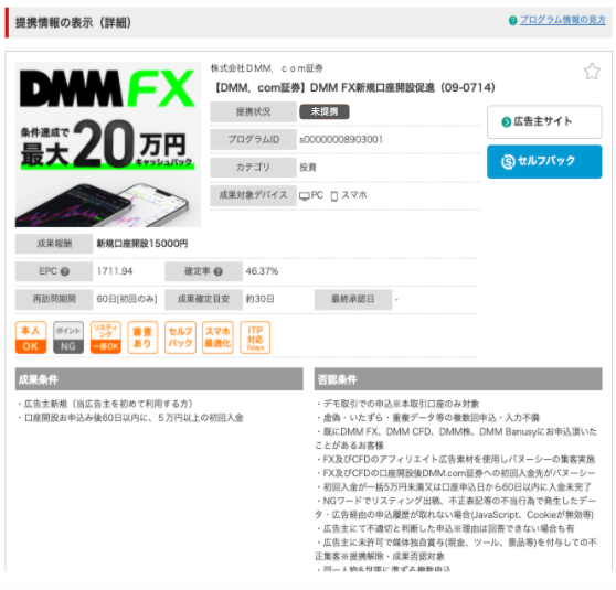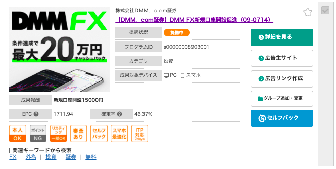 「セルフバック」対象となっている「DMM FX新規口座開設促進」を選択してみましょう。