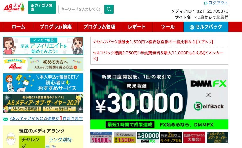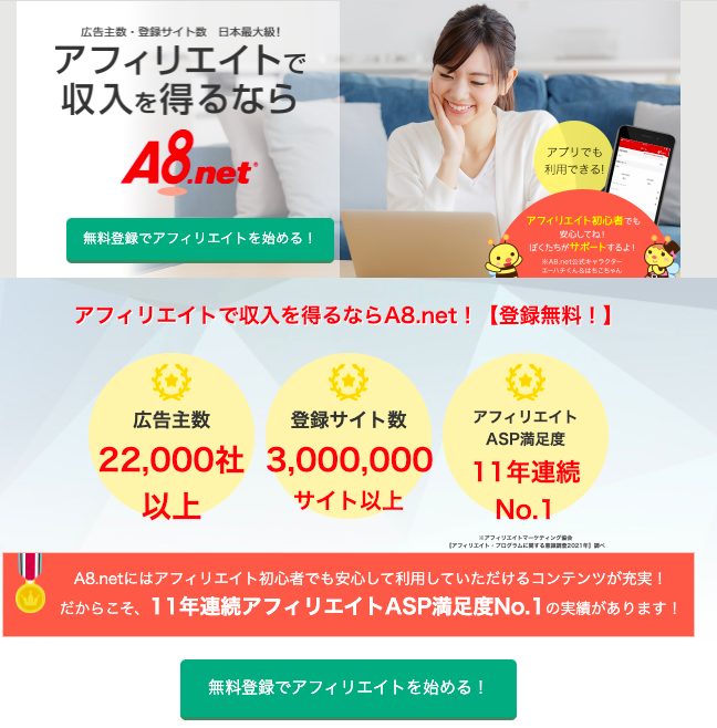 様々なASPがありますが、最大級の広告掲載数を誇る「A8.net」に登録しましょう。