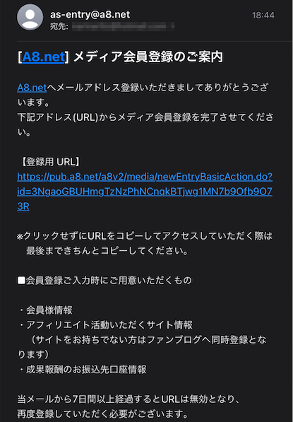 入力したメールアドレス宛に、A8.netからのメールが届いてるはずです。