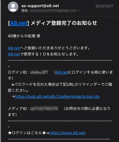 「【A8.net】メディア登録完了のお知らせ」というタイトルのメールを開封しましょう。