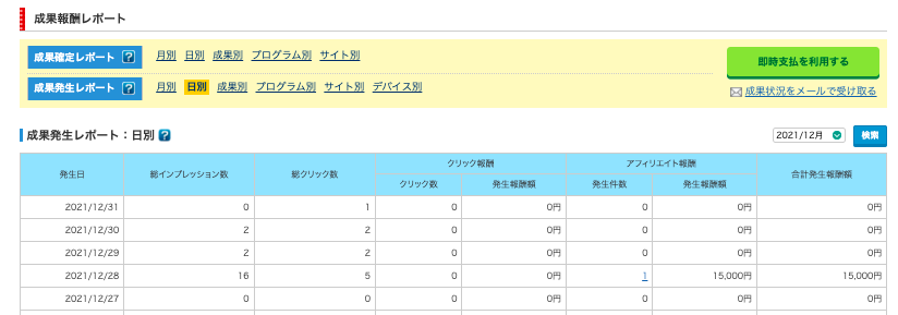 アフィリエイト報酬の欄に”15,000円”と表示されていますね。問題なく報酬が発生した証です。