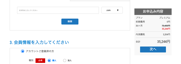入力後、画面右に表示されている「お申込み内容」の「次へ」をクリックしましょう。