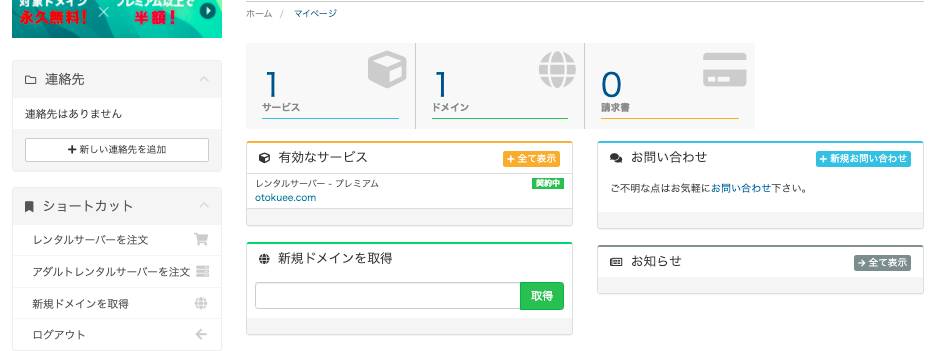 「有効なサービス」において先ほど取得したドメインが「契約中」となっていれば、無事に申込が完了しています。