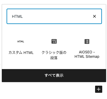 クリック後の画面で上記のように”HTML”と入力すると表示される「カスタムHTML」をクリックしましょう。
