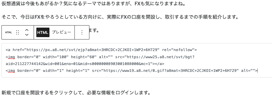 この記事中に先ほどコピーした広告リンクを貼り付けます。